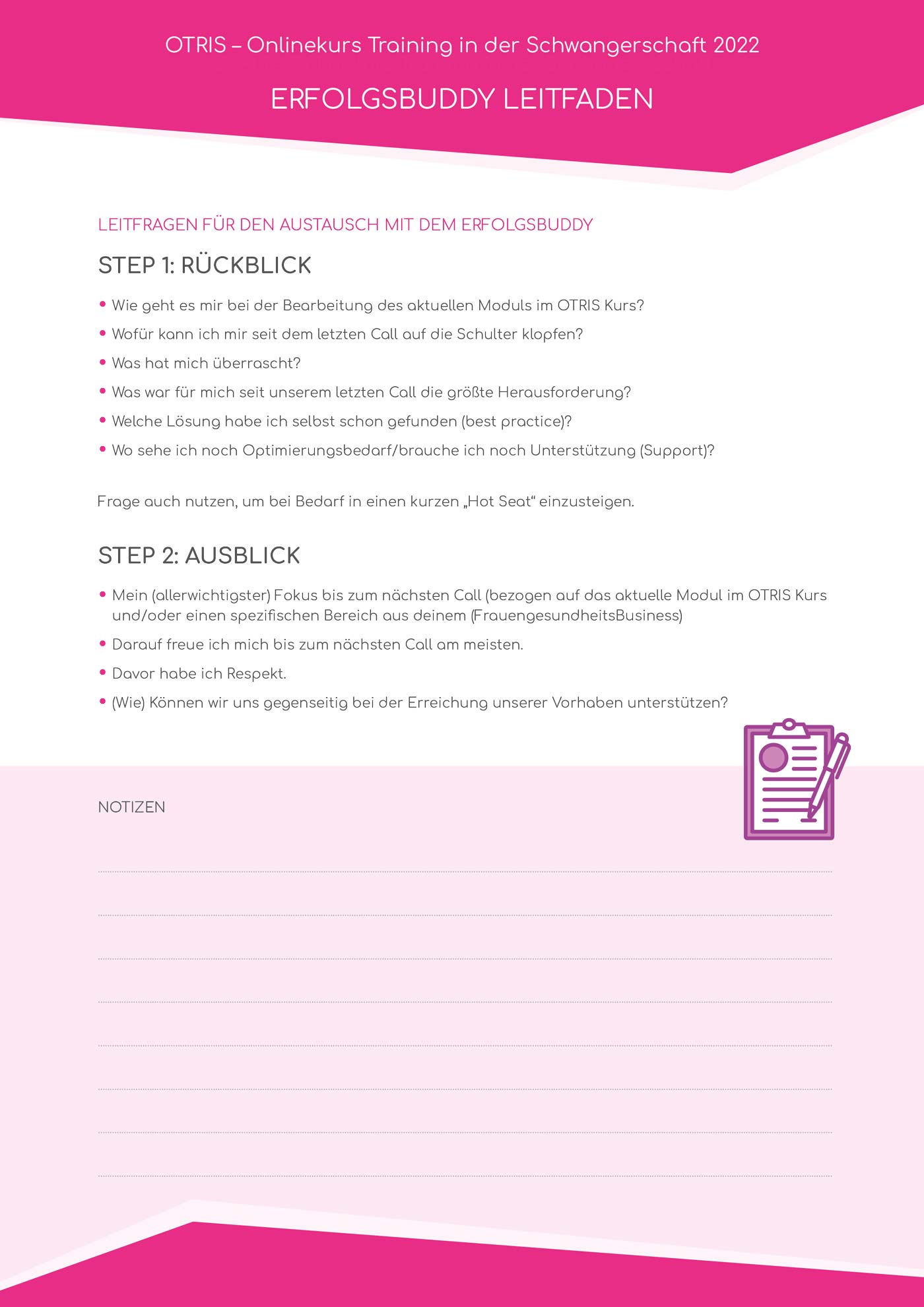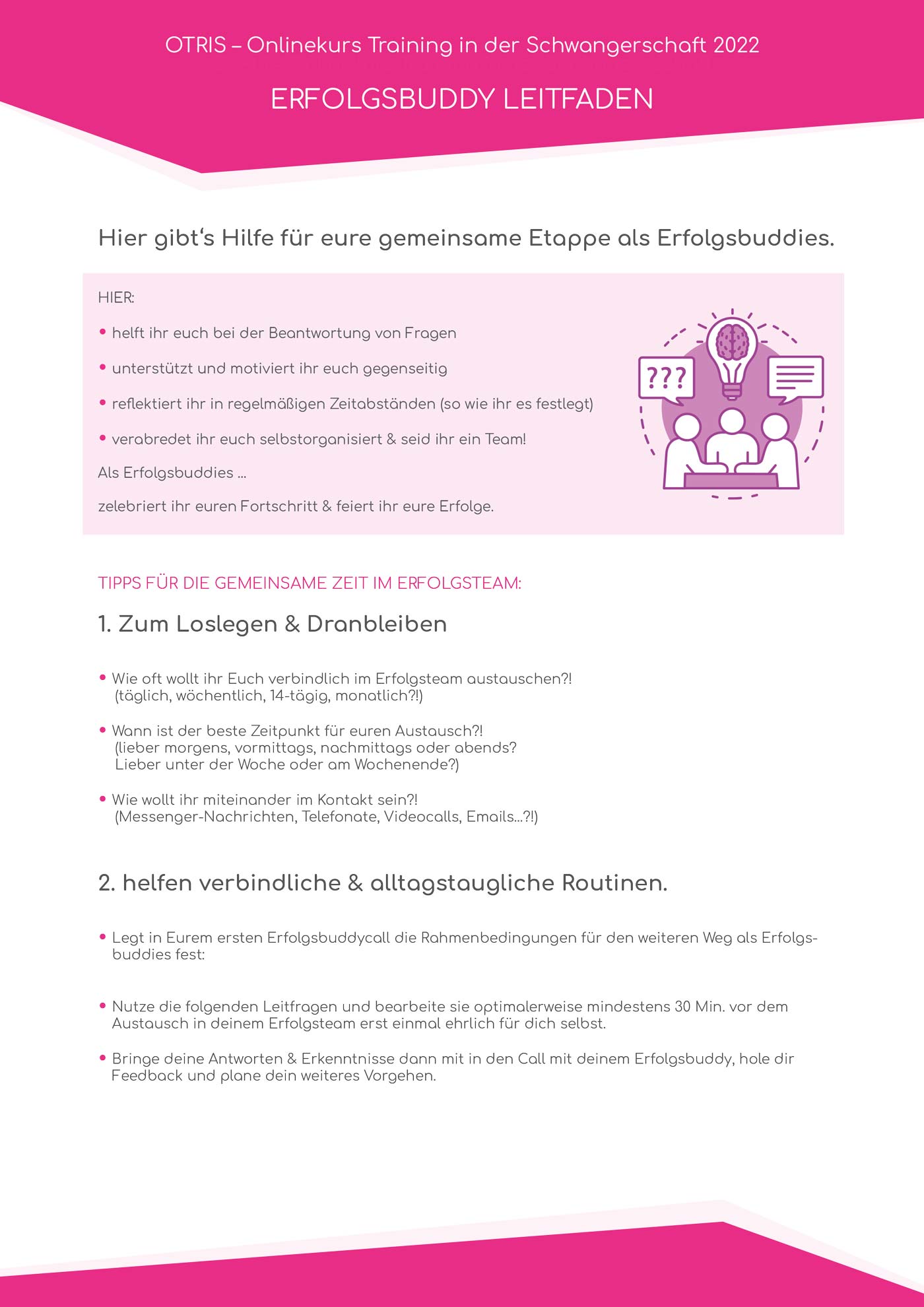 Tausche dich zu jedem Modul mit deinem Erfolgsbuddy aus. Lade dir am Besten gleich den Leitfaden für die Zusammenarbeit mit dem Erfolgsbuddy herunter. Wir werden dich an allen relevanten Stellen immer wieder zu diesem Dokument verweisen. Denn: GEMEINSAM macht alles noch viel mehr Freude 🙌🏻
